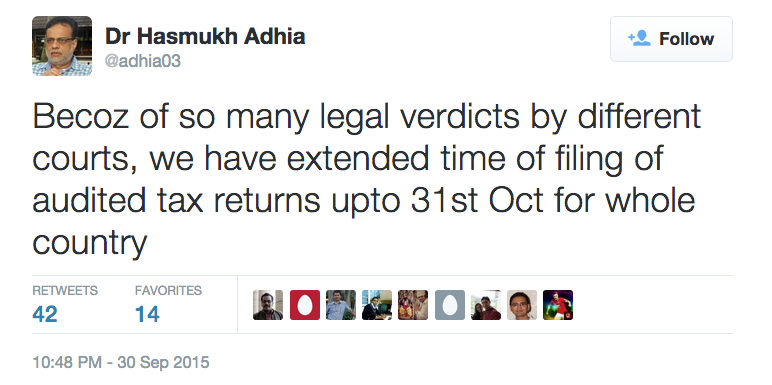 Government of India Ministry of 1961 Subject:- Extension of due date of filing return of income for Assessment Year 2015-16 regarding. The Central Board of Direct Taxes, in exercise of powers conferred under section 119 of the Income-tax Act, 1961, hereby extends the `due-date' for filing ... Read Here